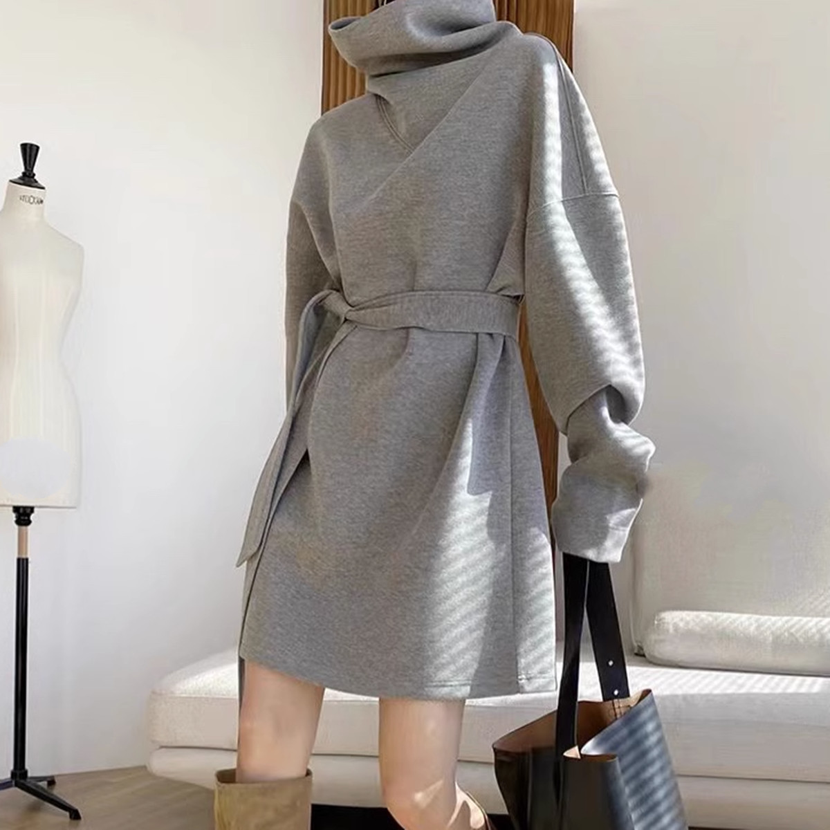론데즈 맨투맨 원피스 하이넥 벨티드 미디 루즈핏 투웨이 그레이