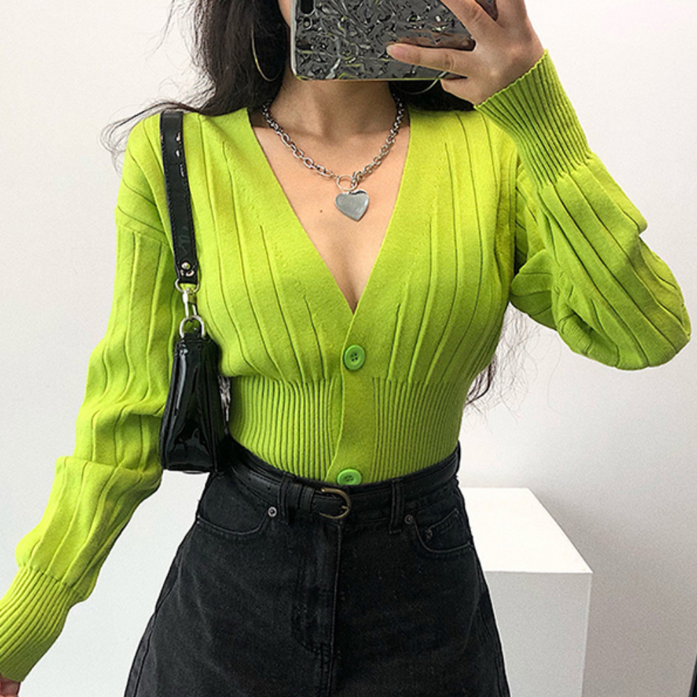여성 V넥 베이직 하이웨스트 크롭 숏 니트 가디건
