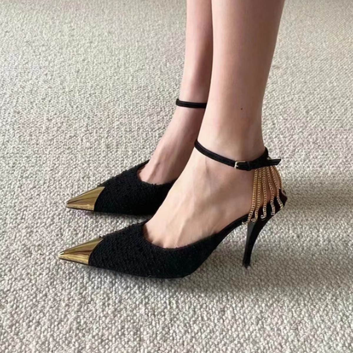 여성 버클 금장체인 토 앵클 스틸레토 스트랩 힐