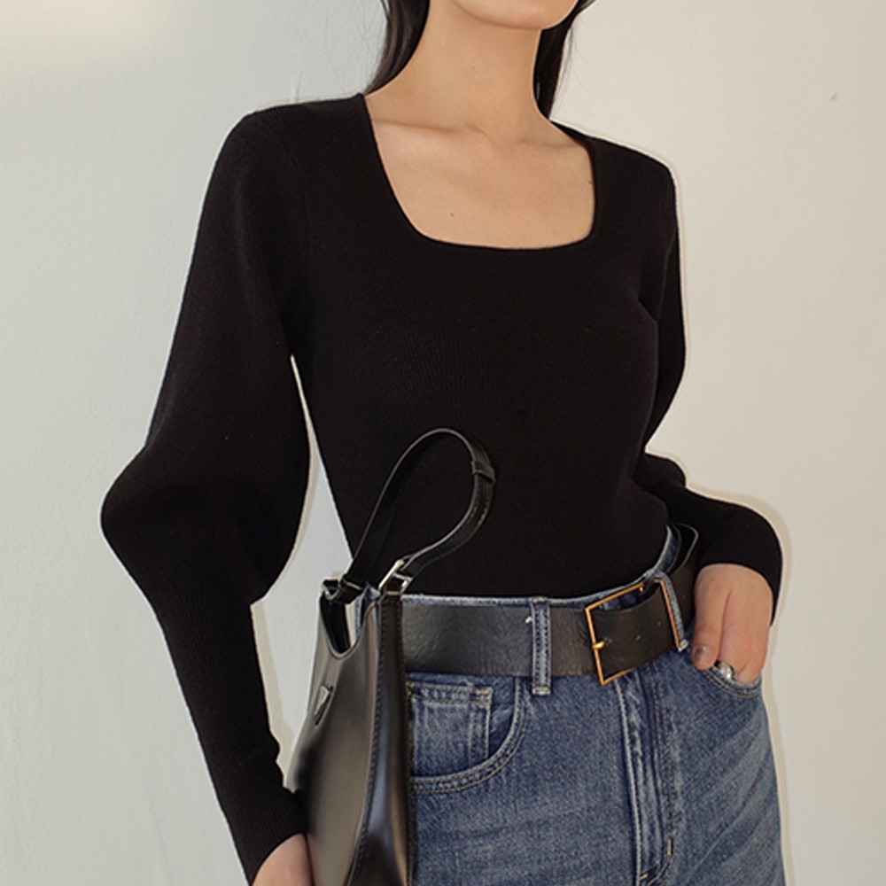 여성 코스 스퀘어 넥 울 스트레치 퍼프소매 볼륨 슬림 니트탑 3컬러