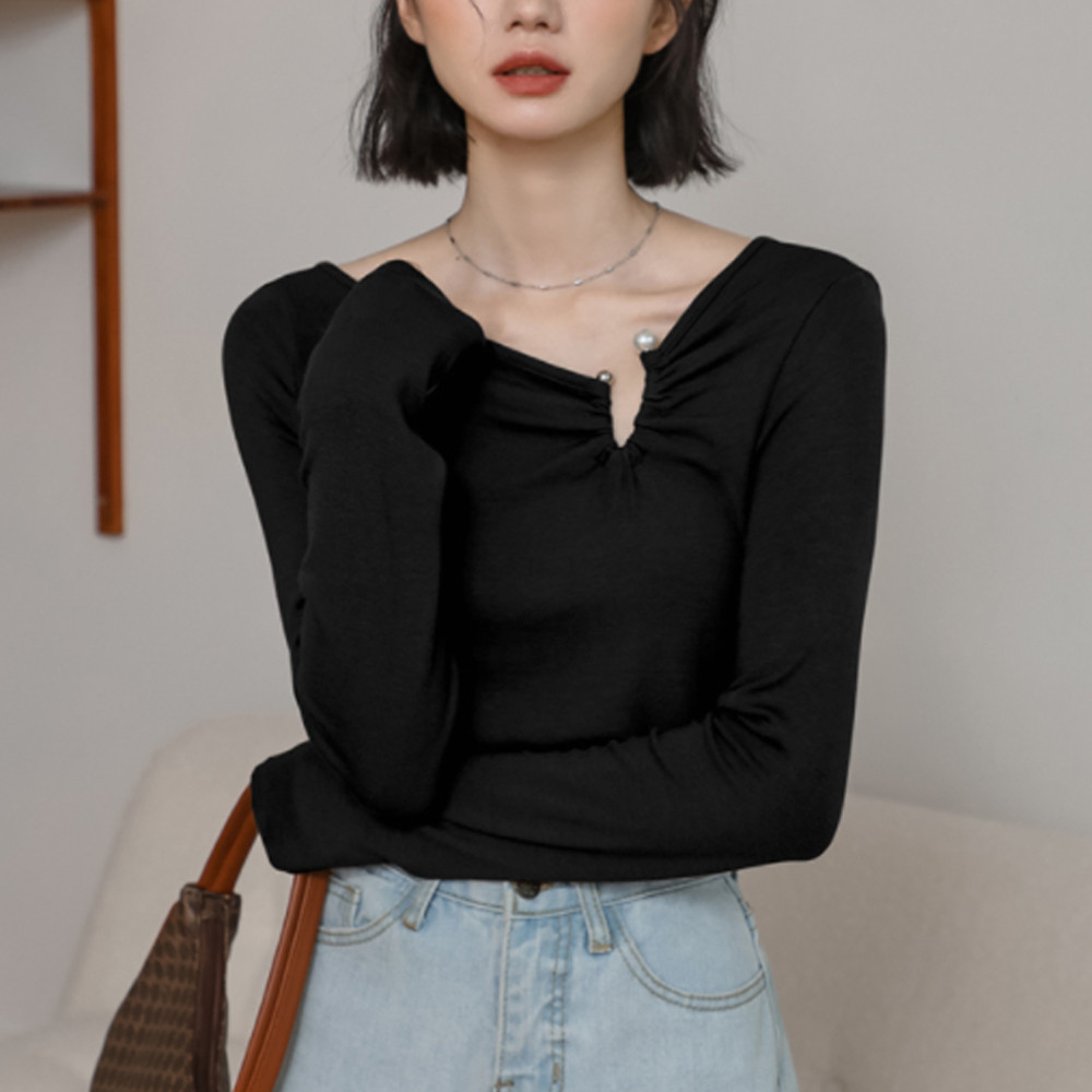 여자 여성 브이넥 펄 진주 꼬임 셔링 디자이너 비대칭 슬림핏 긴팔 텐셀 티셔츠 2컬러