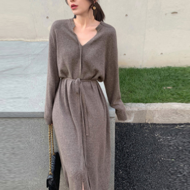 브이넥 루즈핏 울 니트 허리 끈 원피스 2컬러