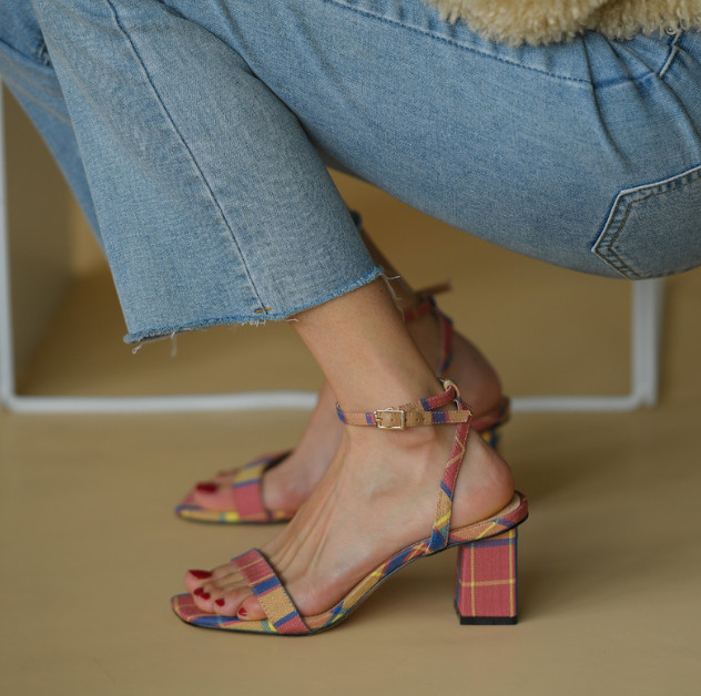 [론데즈메종] 스윗 비비안 컬러패턴 격자 체크 스트랩 수제 샌들 힐