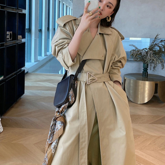 트라이앵글 버클 벨트 포인트 드레이프 롱 트렌치 코트 자켓