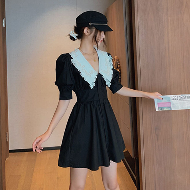 [론데즈메종] 와이드 레이스 빅카라 퍼프슬리브 햅번 미니원피스