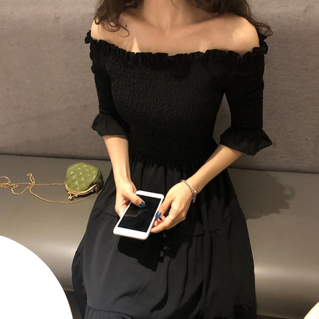 [론데즈메종] 슬림 오프숄더 쉬폰 롱 플레어 원피스 (2Colors)