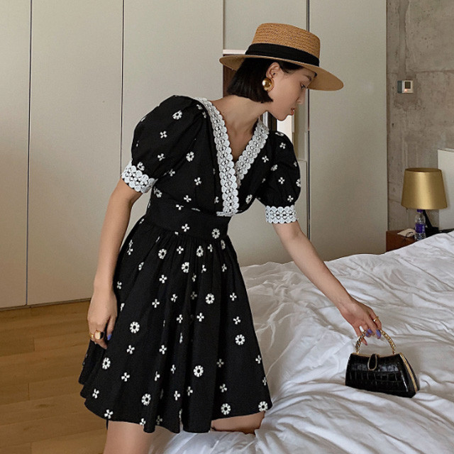[론데즈메종] 모던 플라워 자수 브이넥 퍼프슬리브 미니원피스