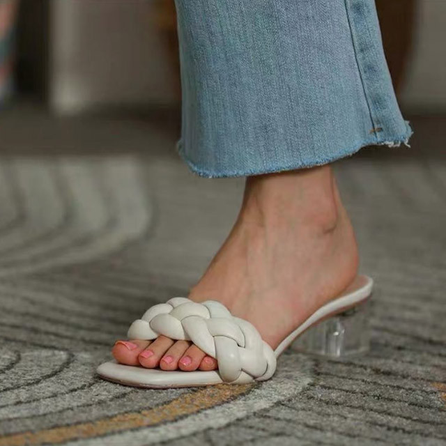 [론데즈메종] 폼폼 가죽꼬임 스트랩 크리스탈 굽 뮬샌들 힐 2컬러