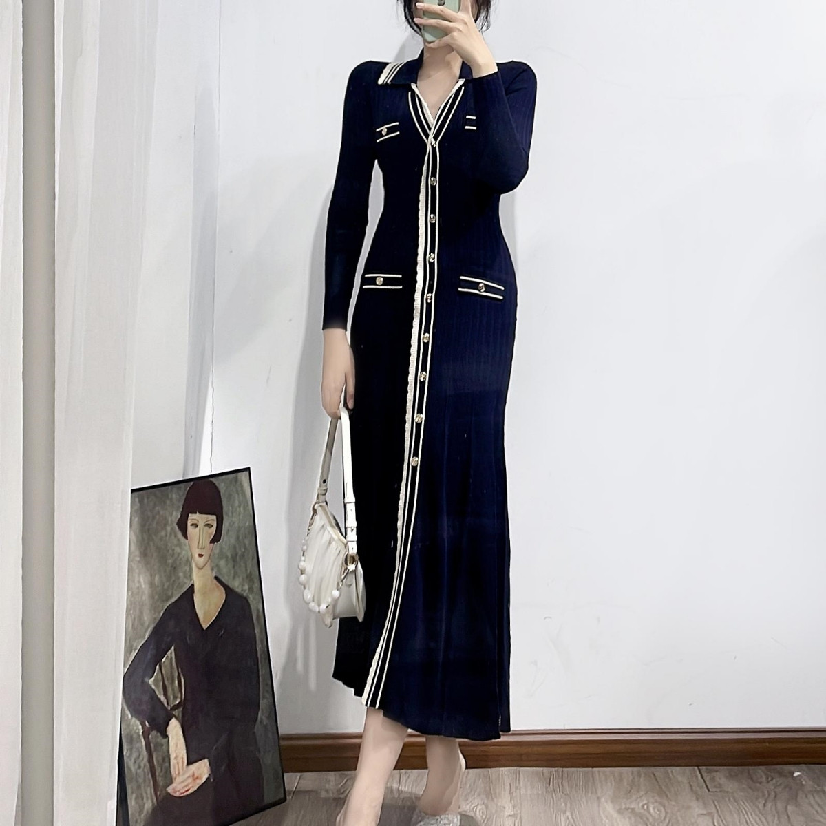 론데즈 산드로 롱 니트 V넥 슬림 카라 하객 피로연 원피스