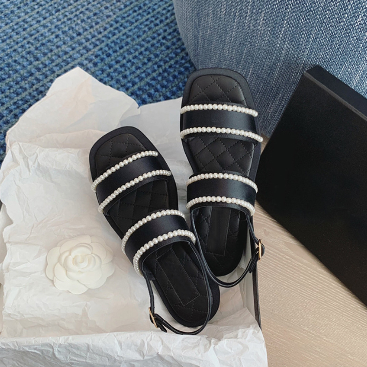 론데즈메종 여름 진주디테일 퀼팅 새틴 스트랩 슬링백 스퀘어 토 통굽 뮬 슬리퍼 샌들