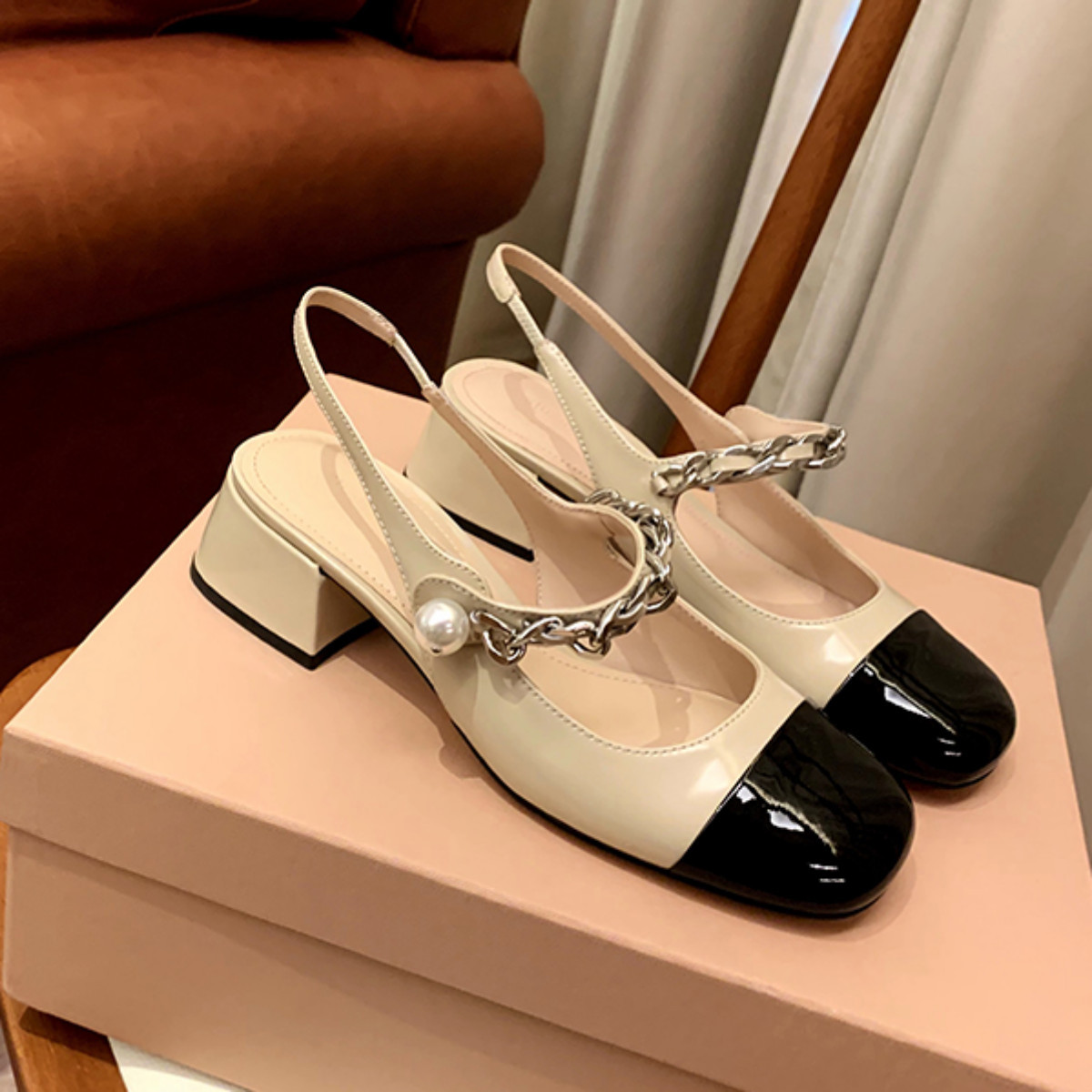 론데즈 미우 슬링백 에나멜 가죽 배색 진주 체인 통굽 펌프스 발레리나 메리제인 슈즈 구두