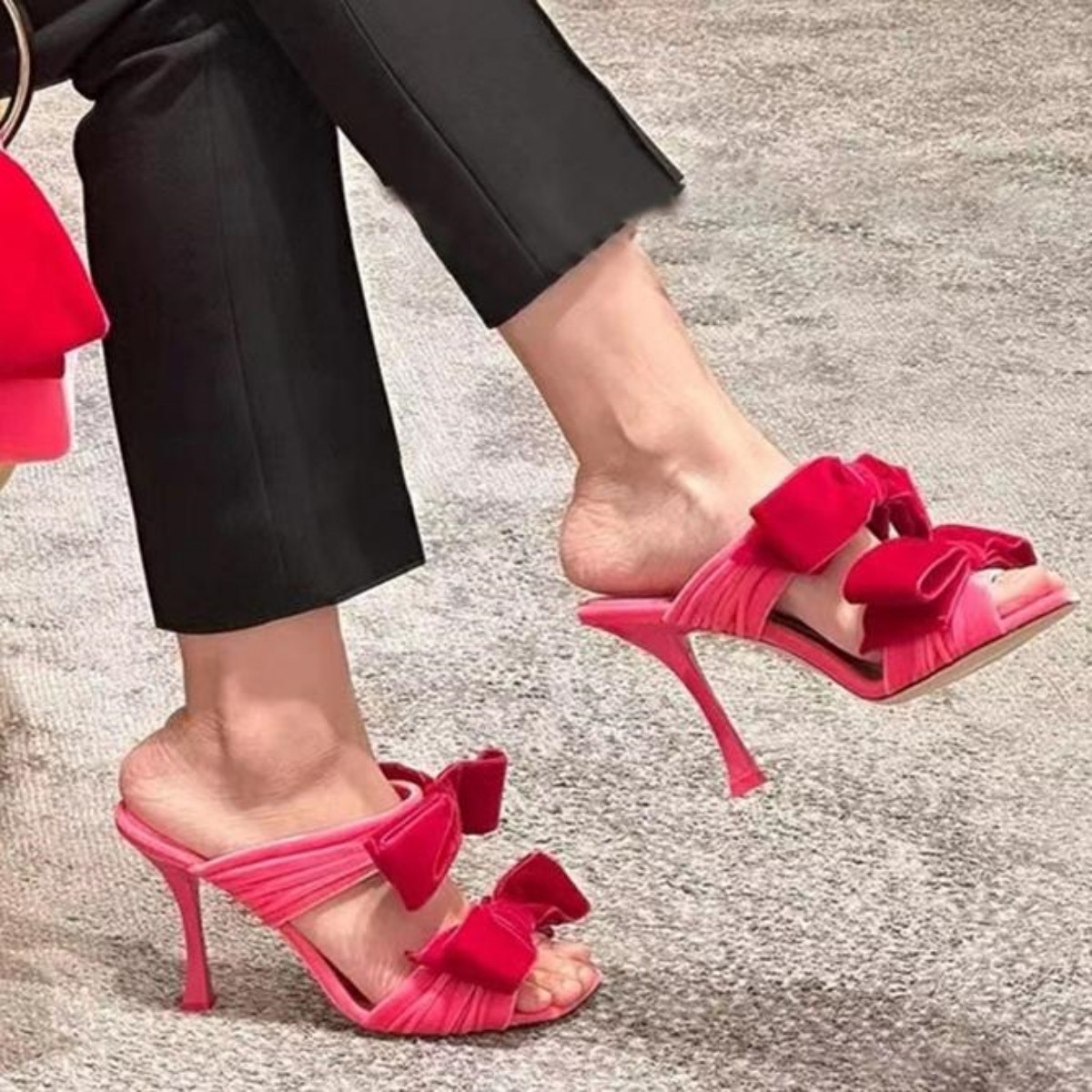 론데즈 벨벳 리본 스퀘어토 양가죽 페이던트 스틸레토 스트랩 샌들 뮬 힐