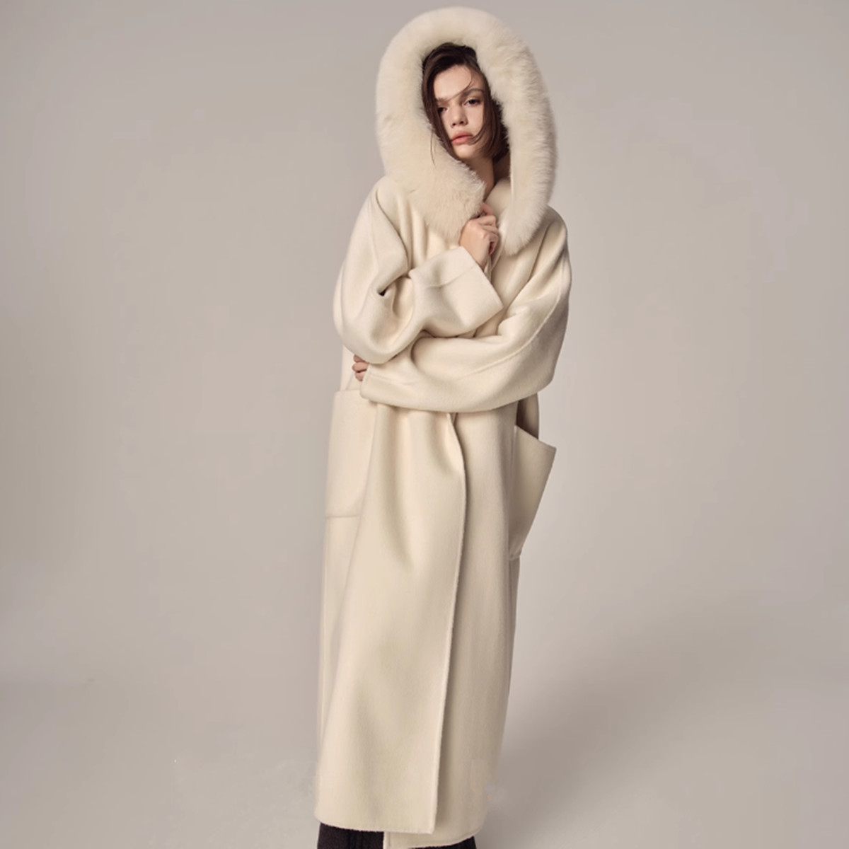 론데즈 폭스퍼 후드 핸드메이드 울100 맥시롱 코트