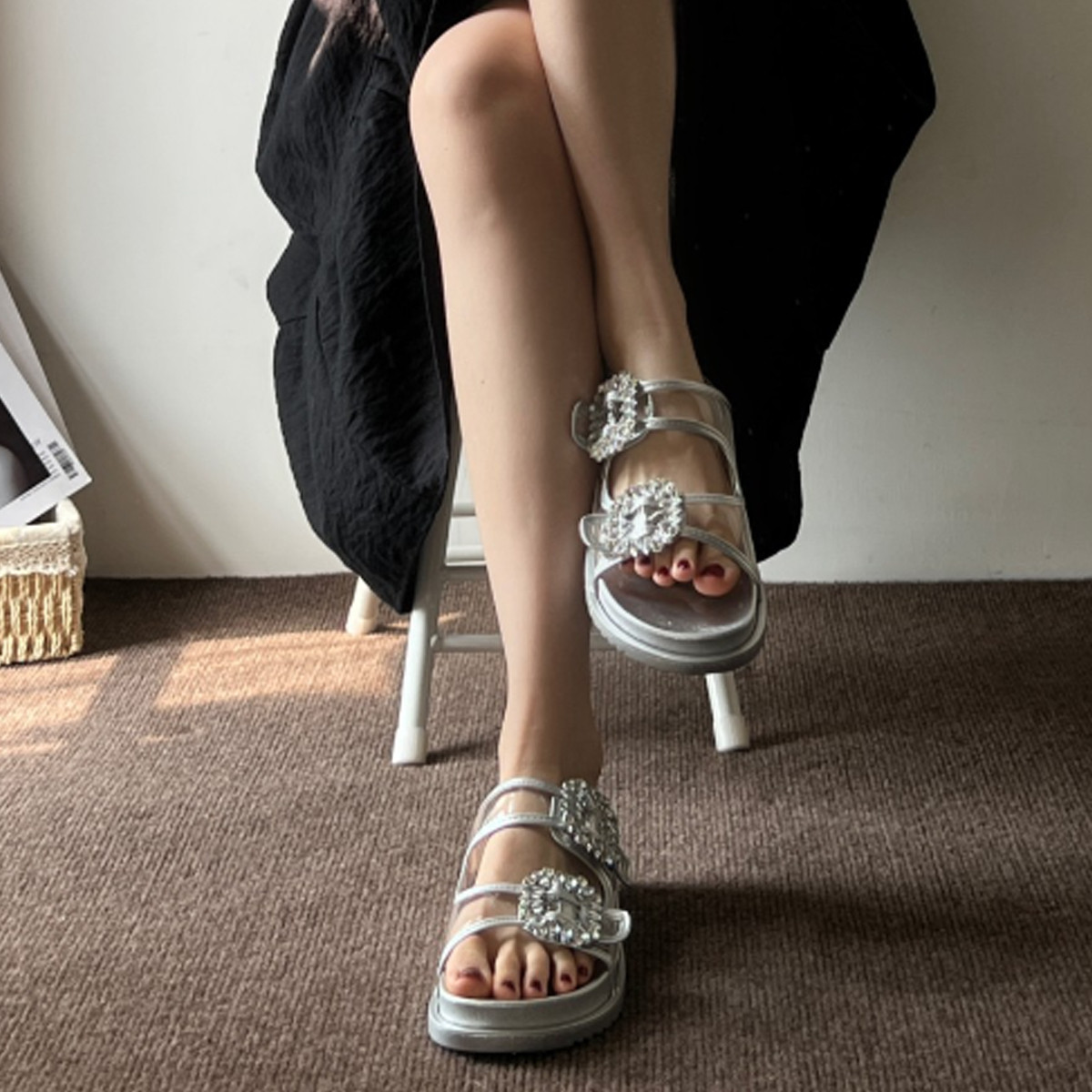 론데즈 로저 버클 큐빅 PVC 투명 스트랩 키높이 비치 굽 슬리퍼 뮬 샌들