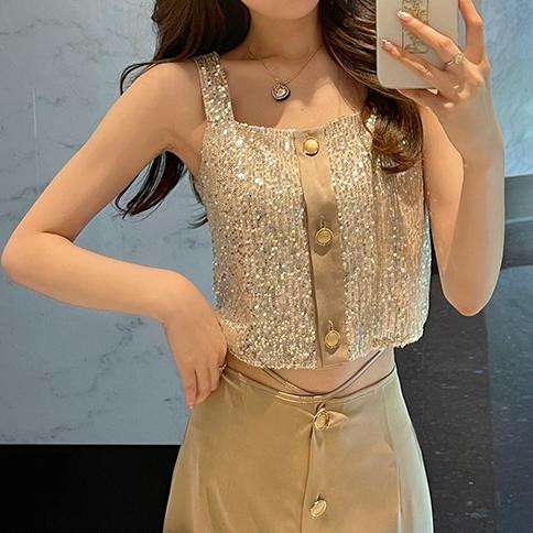 드림 스팽글 크롭 블라우스 나시 반팔 여성 여름 티셔츠