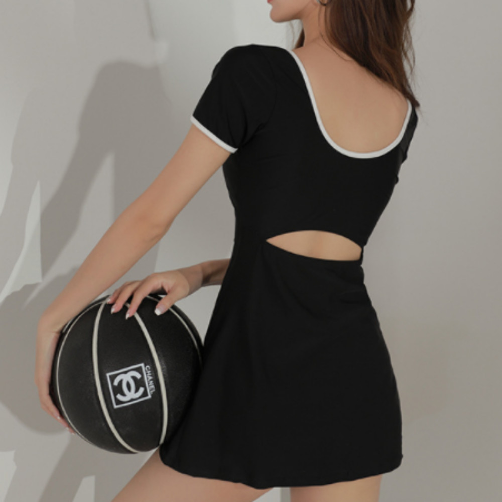 여성 여름 심플 스포티 배색 모노키니 점프슈트 반팔 플레어 수영복