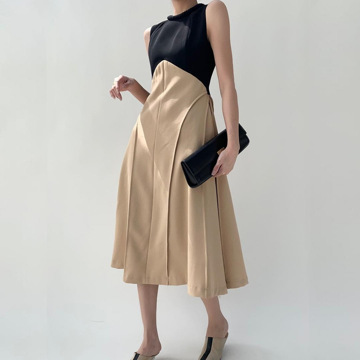 론데즈 엣지 여성 여름 배색 민소매 유니크넥 롱 스커트 원피스