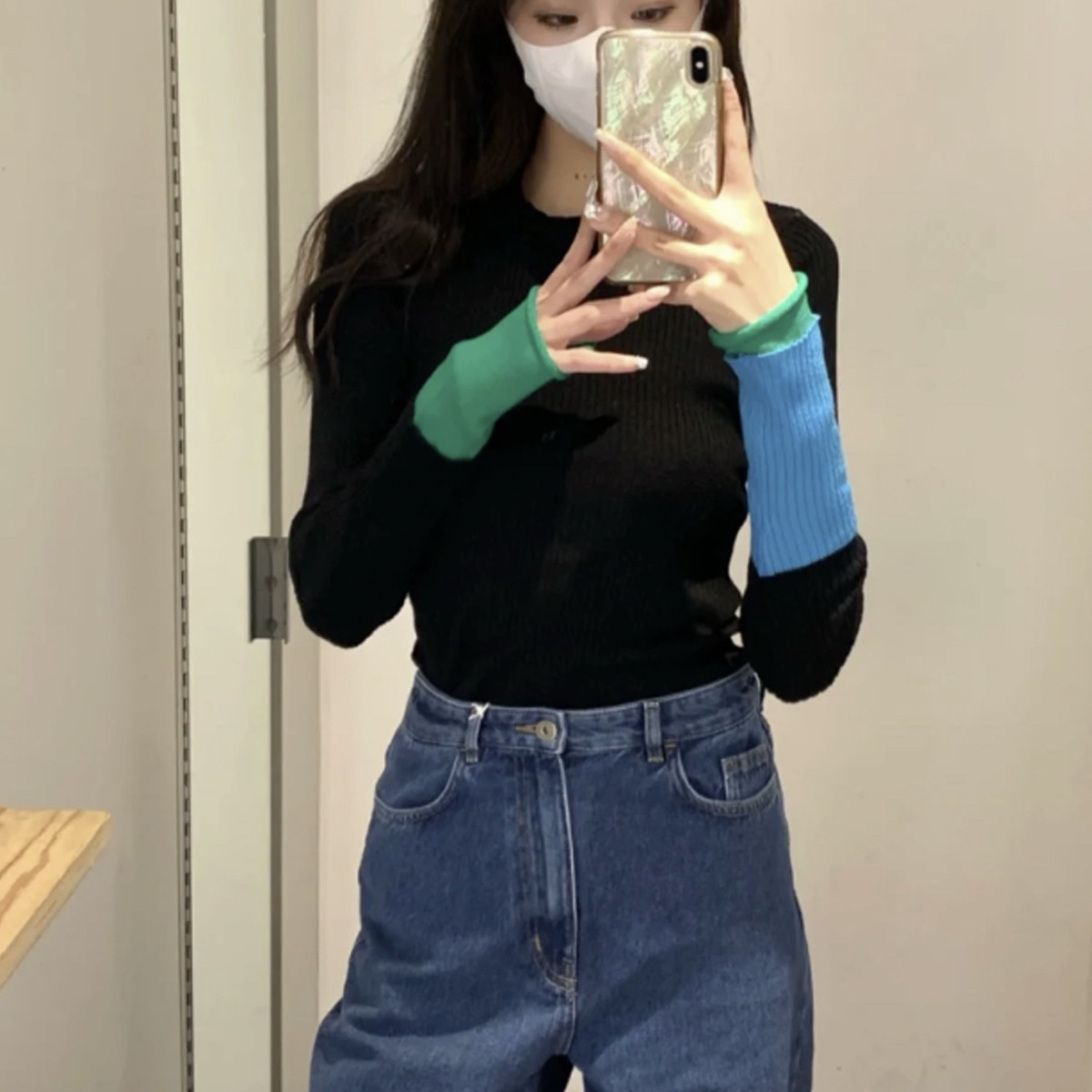 론데즈 코스 텐셀 슬림 긴팔 컬러 배색 포인트 소매 골지 니트 티