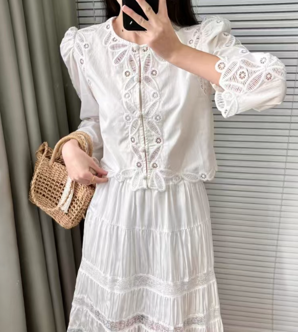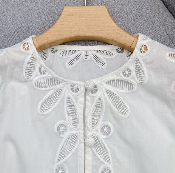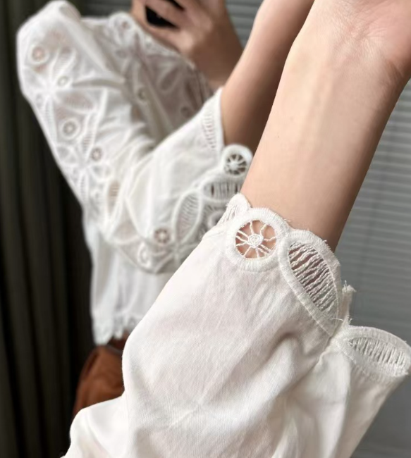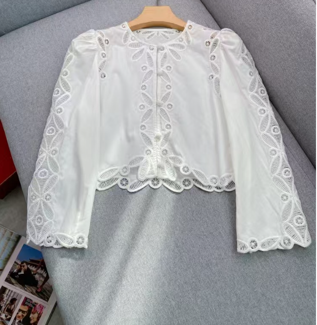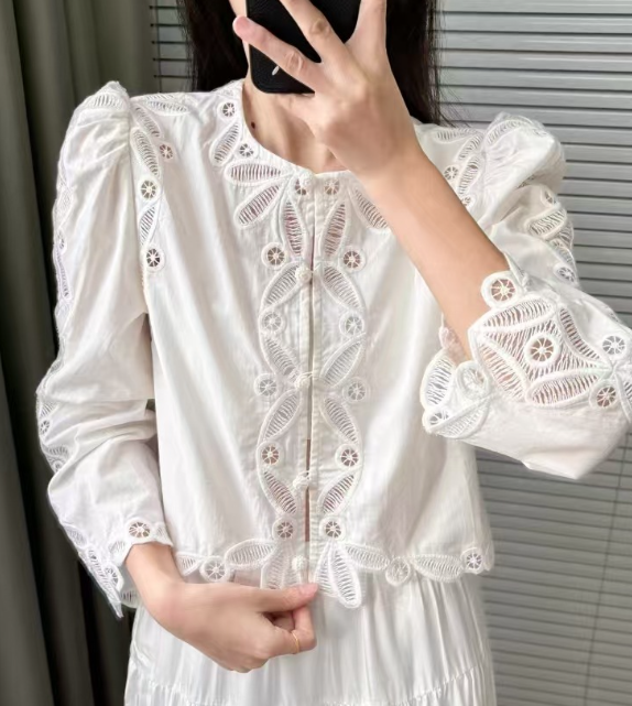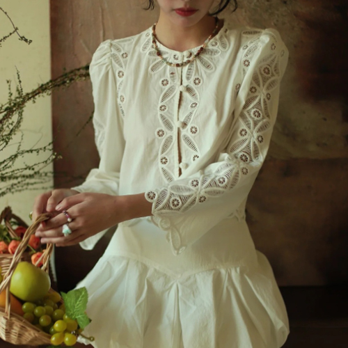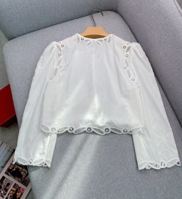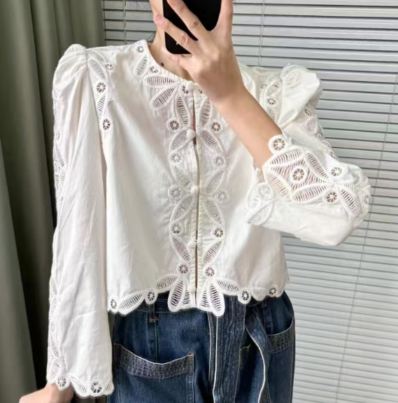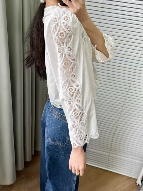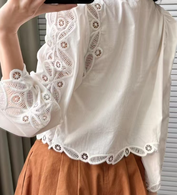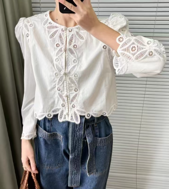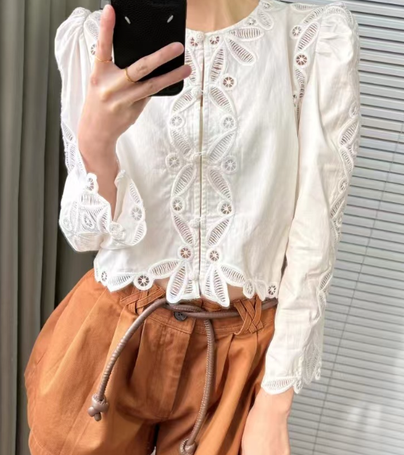 수공예 자수로 제작된, 명품스타일 프렌치 자수 크롭 블라우스