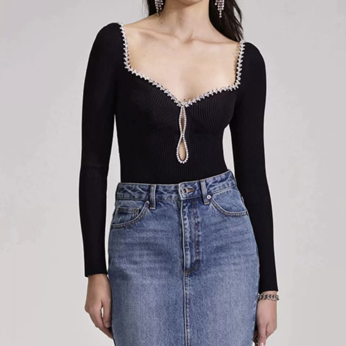 론데즈 텐셀 슬림 긴팔 지르코니아 큐빅 트리밍 브이넥 골지 니트 티