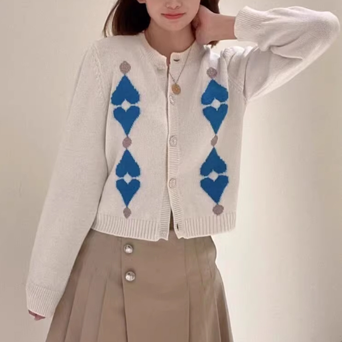론데즈 마제 노르딕 자카드 자수 하트 라운드 넥 울 니트 여성 가디건 봄가을