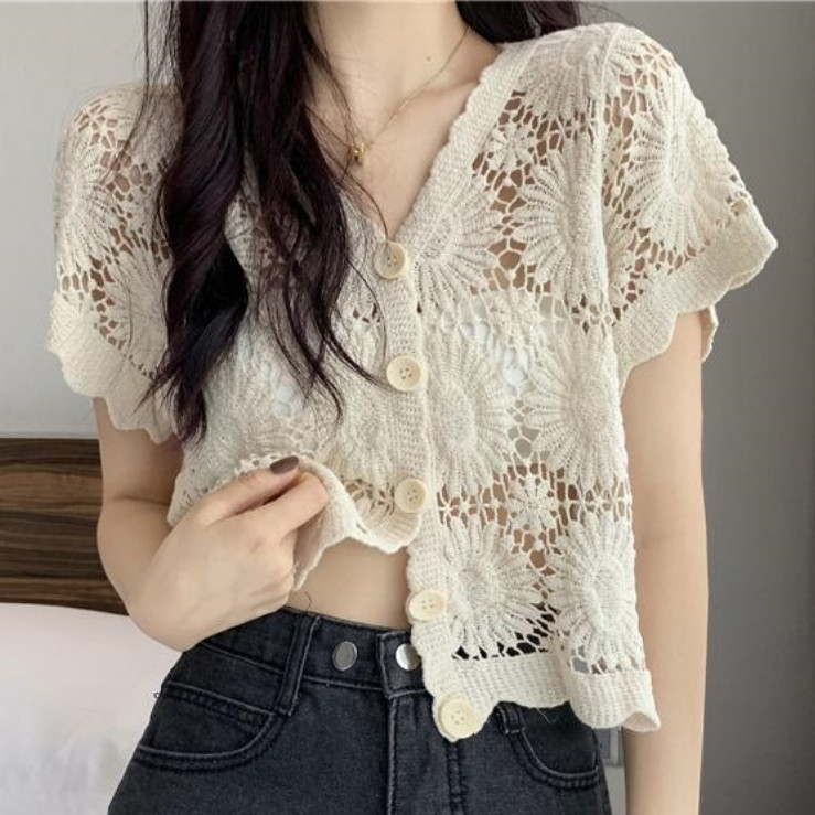 여성 여름 프렌치 레이스 시스루 펀칭 반팔 V넥 볼레로 가디건