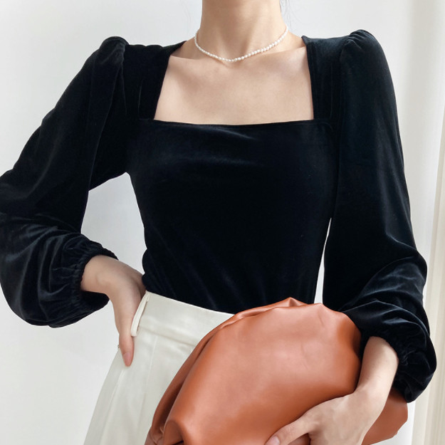 룩스 벨벳 스퀘어넥 퍼프 소매 블라우스 티셔츠