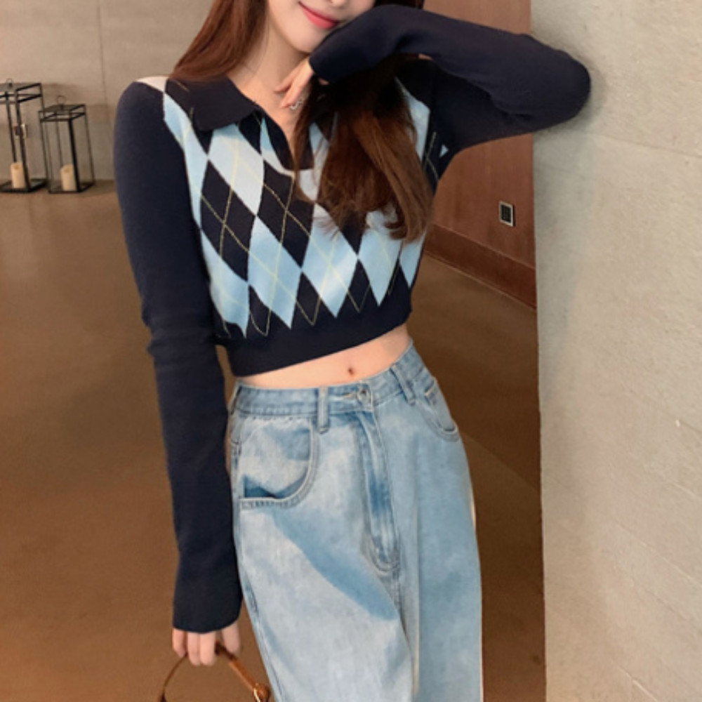 시드니 아가일 긴팔 크롭 니트 여성 가을 티셔츠