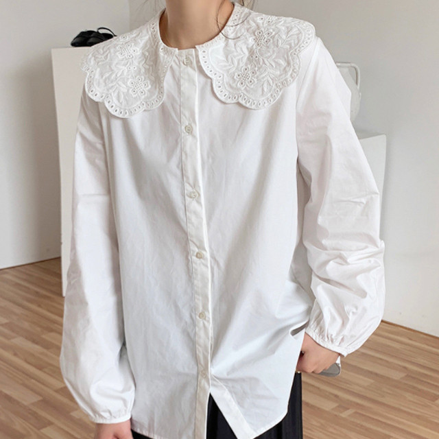 레이어드 레이스 자수 펀칭 둥근 빅카라 셔링 퍼프 벌룬 소매 블라우스 셔츠