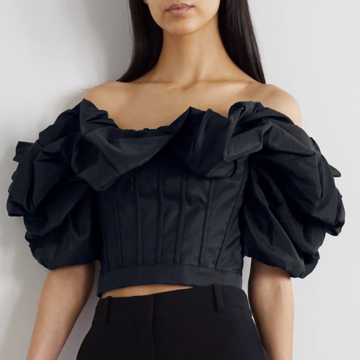 프렌치 팰리스 스퀘어 브이넥 볼륨 크롭 반팔 블라우스 티