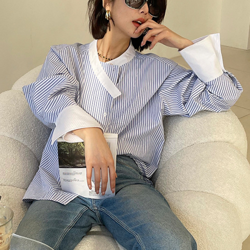 론데즈 여성 배색 카라 퍼프 블루 스트라이프 패턴 봄 셔츠 블라우스