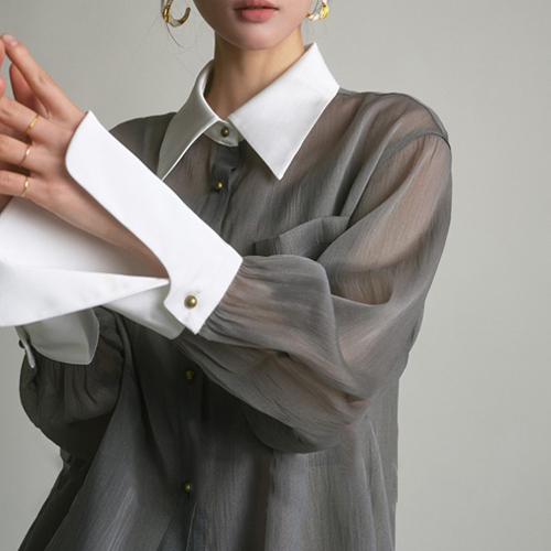 론데즈 오간자 블라우스 빅카라 배색 봄여름 루즈핏 시스루 셔츠 하객룩