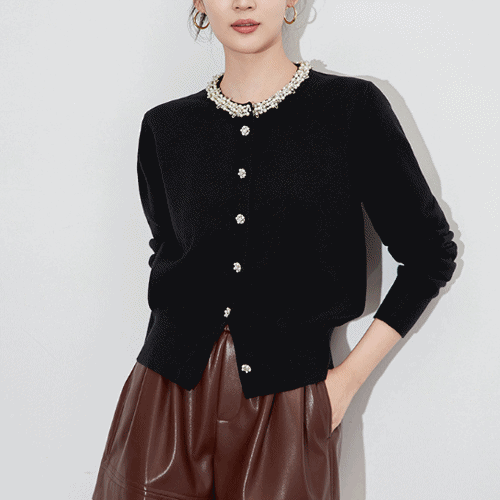 론데즈 산드 벨벳 카라 크롭 울 니트 가디건