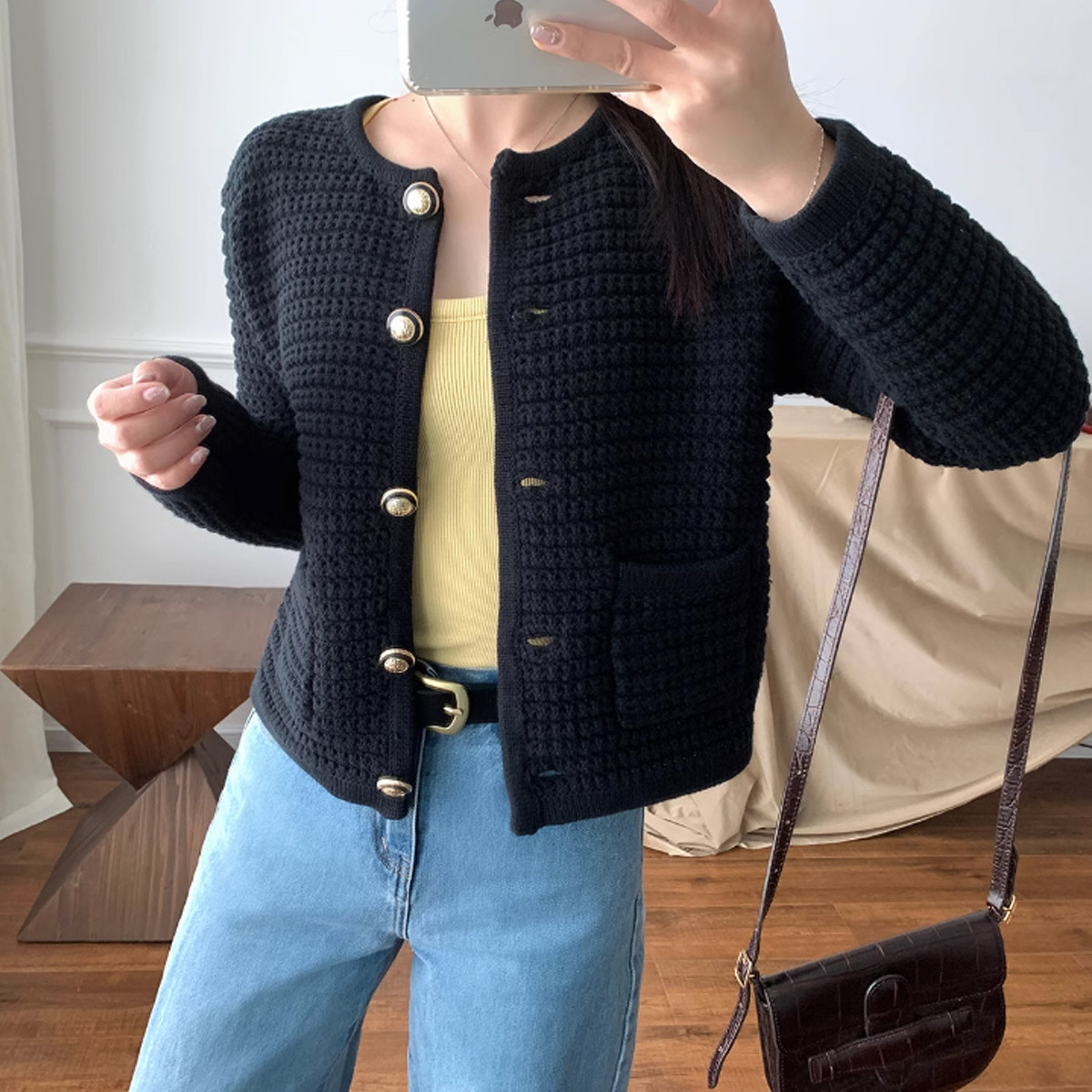론데즈 긴팔 크롭 가디건 마쥬 라운드넥 니트 금장버튼 숏 봄 가을 자켓