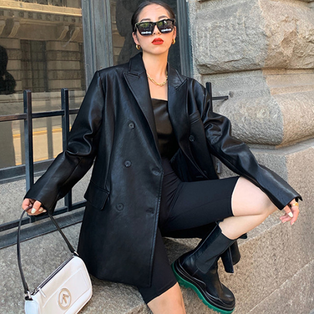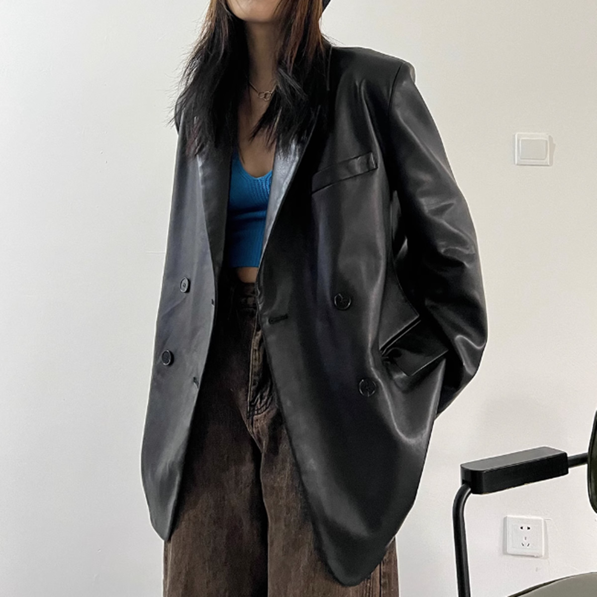 뉴레트로 시크 블랙 박시핏 레더 가죽 싱글 테일러드 자켓