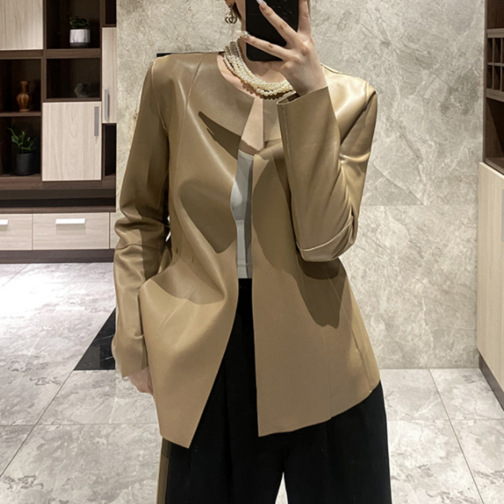 여성 리얼 양가죽 베이직 노카라 퍼프소매 루즈핏 크롭 가죽 자켓