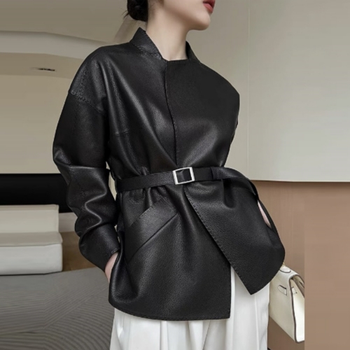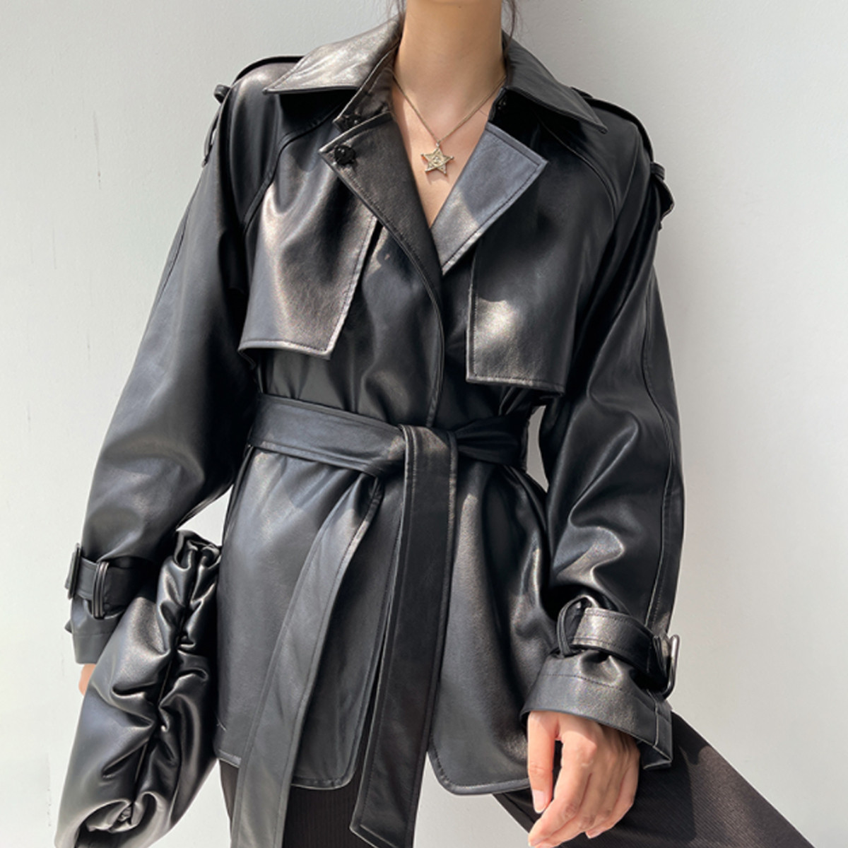 여성 시크 PU가죽 레더 트렌치 루즈핏 허리벨트 숏 자켓 봄 가을