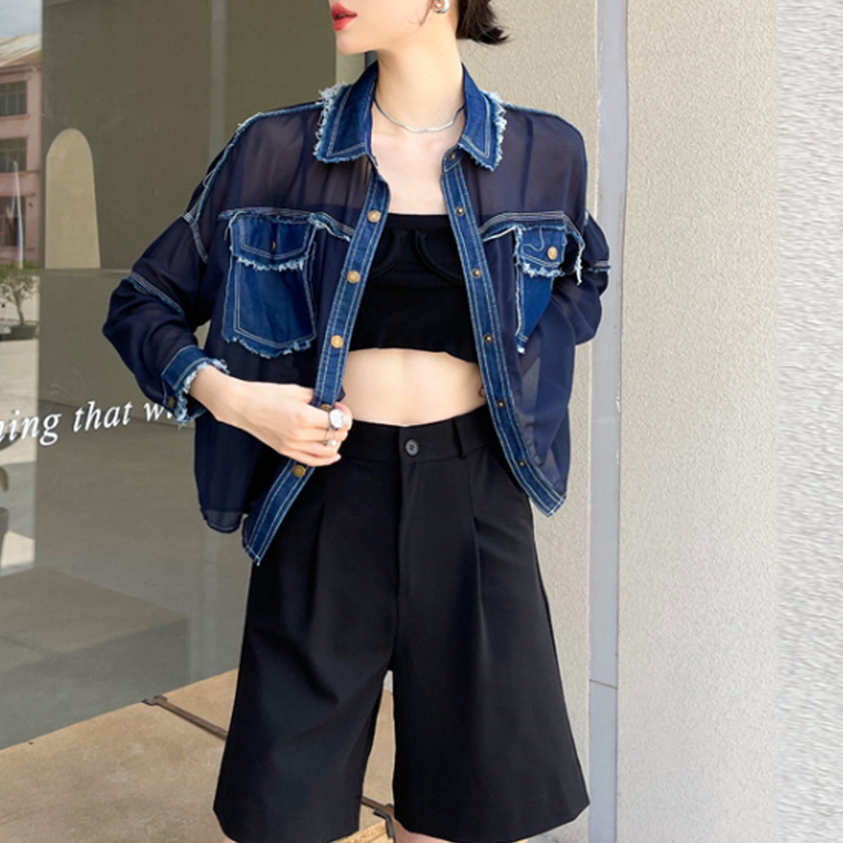 레트로 비비드 블루 진청 데님 스티치 캐주얼 시스루 여름 자켓