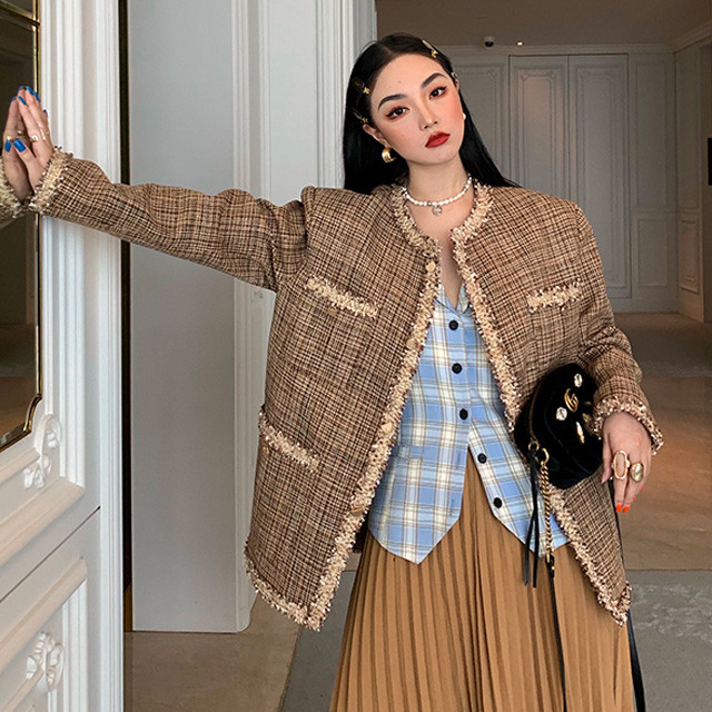 [론데즈메종] 고저스 직조 잔체크 박시핏 트위드 자켓 숏코트
