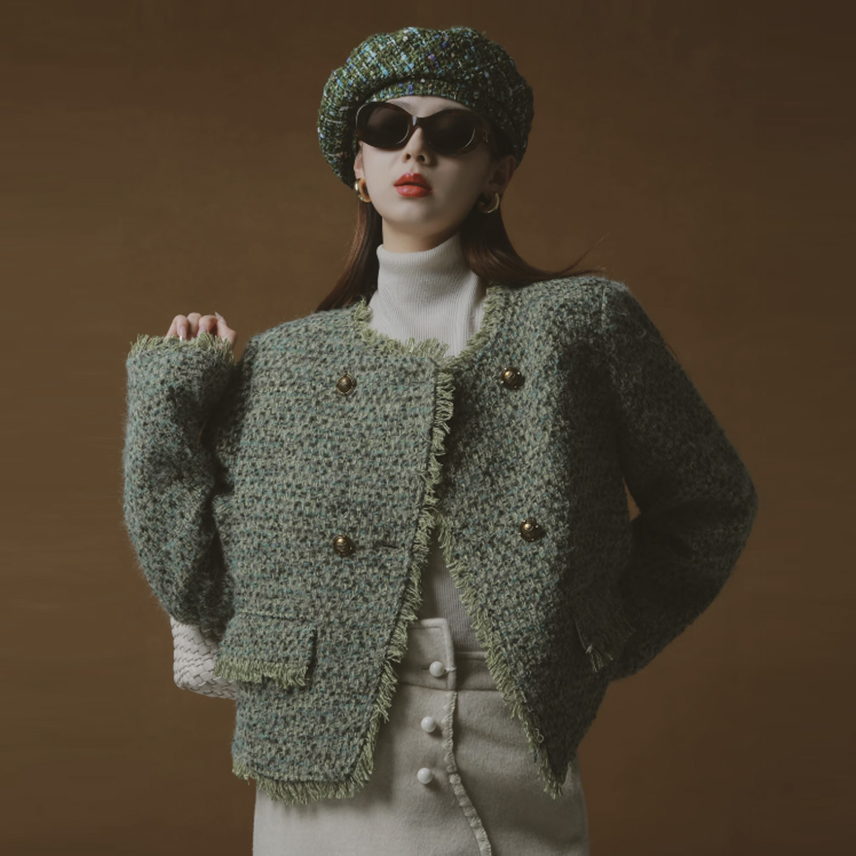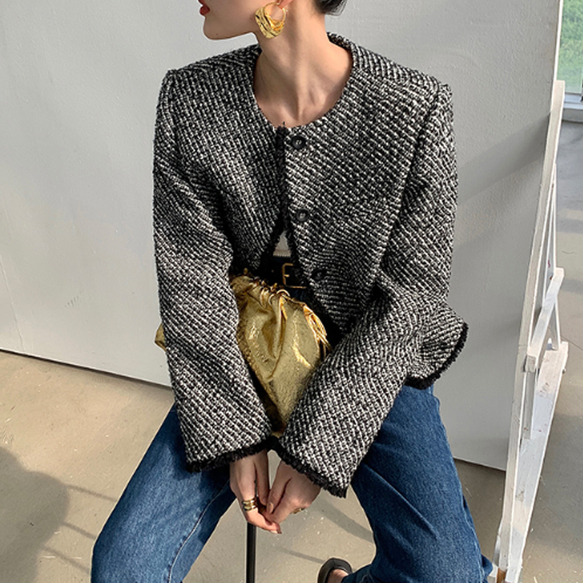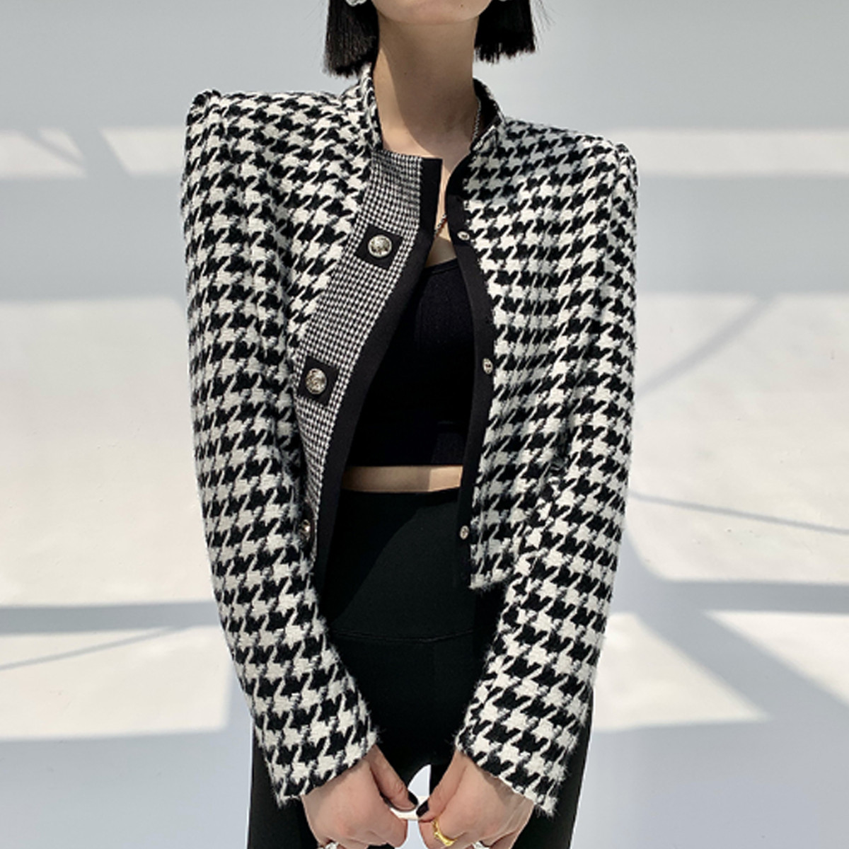 론데즈 여성 레트로 하운드투스 모직 스탠드카라 가을 숏 어깨패드 자켓