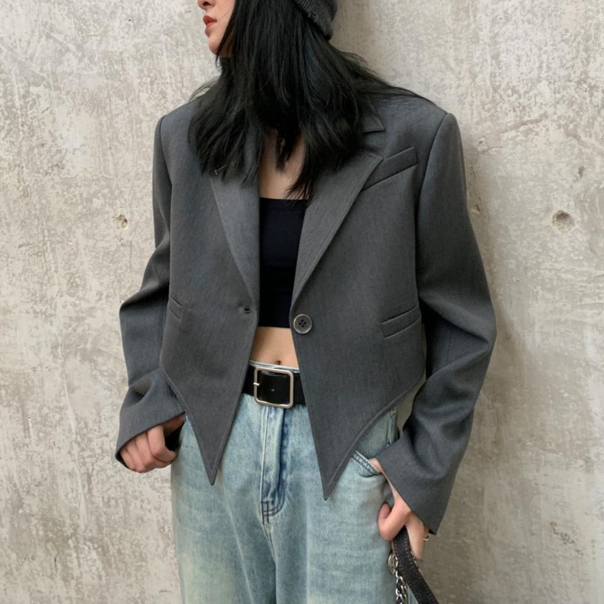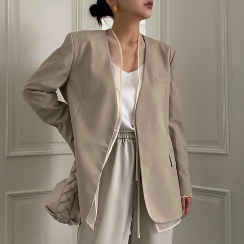 여성 로우 페미닌 오간자 거즈 레이어드 오버핏 울 정장 슈트 자켓