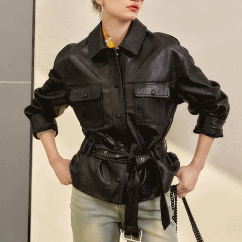[론데즈메종] 소프트 유니크 박시 PU 가죽 허리벨트 미들 숏 자켓 (3Colors)