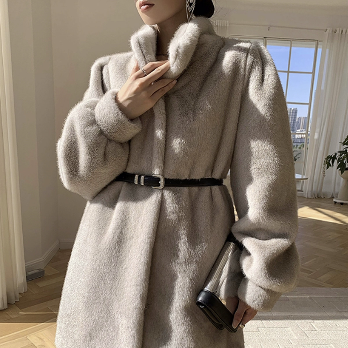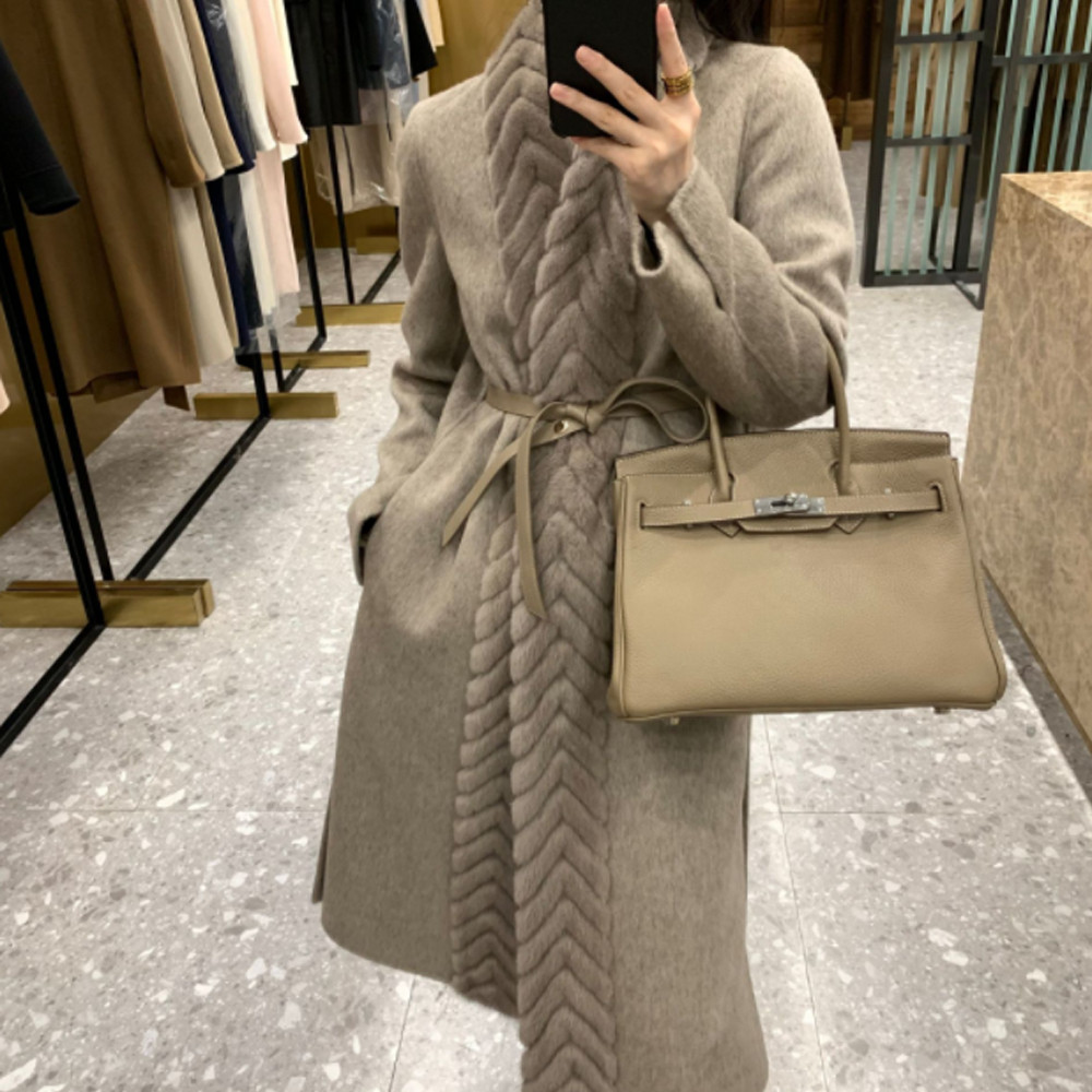 미우 하이넥 에코 밍크퍼 벨트 롱코트 여성 겨울 언발 무스탕룩