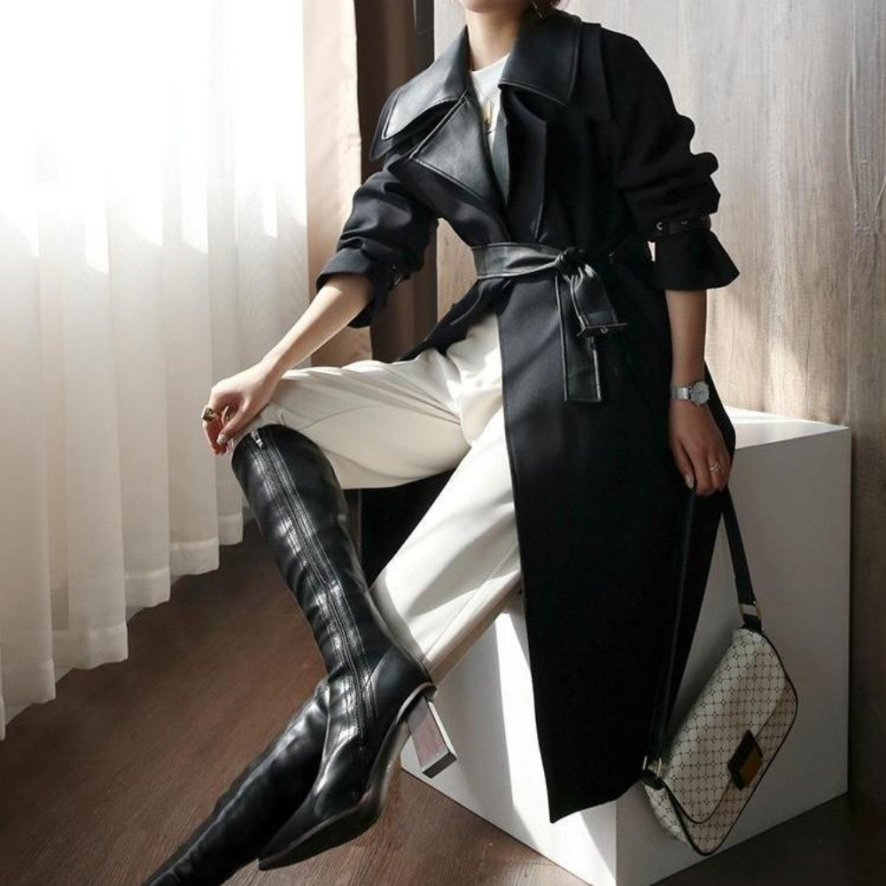 유니크 배색 더블 PU 가죽 카라 허리벨트 여성 봄 가을 롱 트렌치 코트