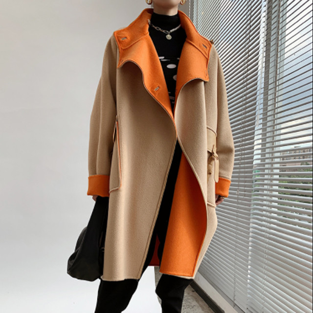 H 캣워크 실루엣 양면 울100% 드레이프 배색 캐시미어 루즈핏 롱코트