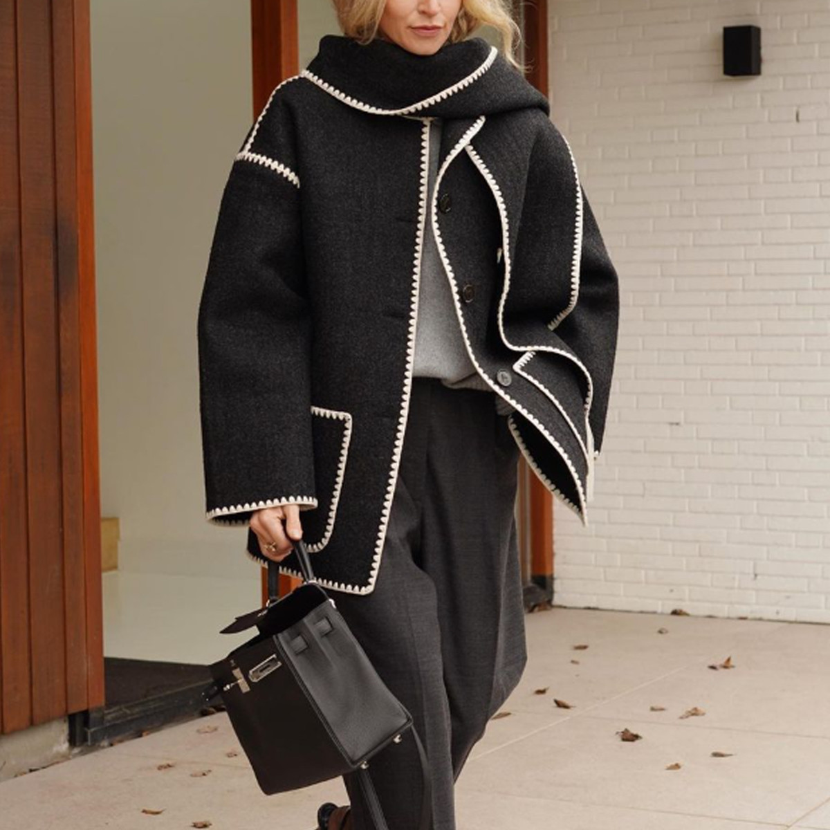 론데즈 여성 수술 바인딩 핸드메이드 머플러 울 모직 코트 가디건 숏자켓 세트