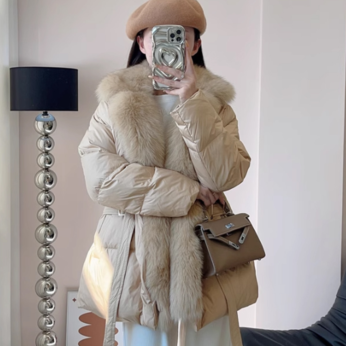 론데즈 B 폭스퍼 오리털100% 슬림핏 벨티드 롱 트렌치 패딩 다운 점퍼 코트