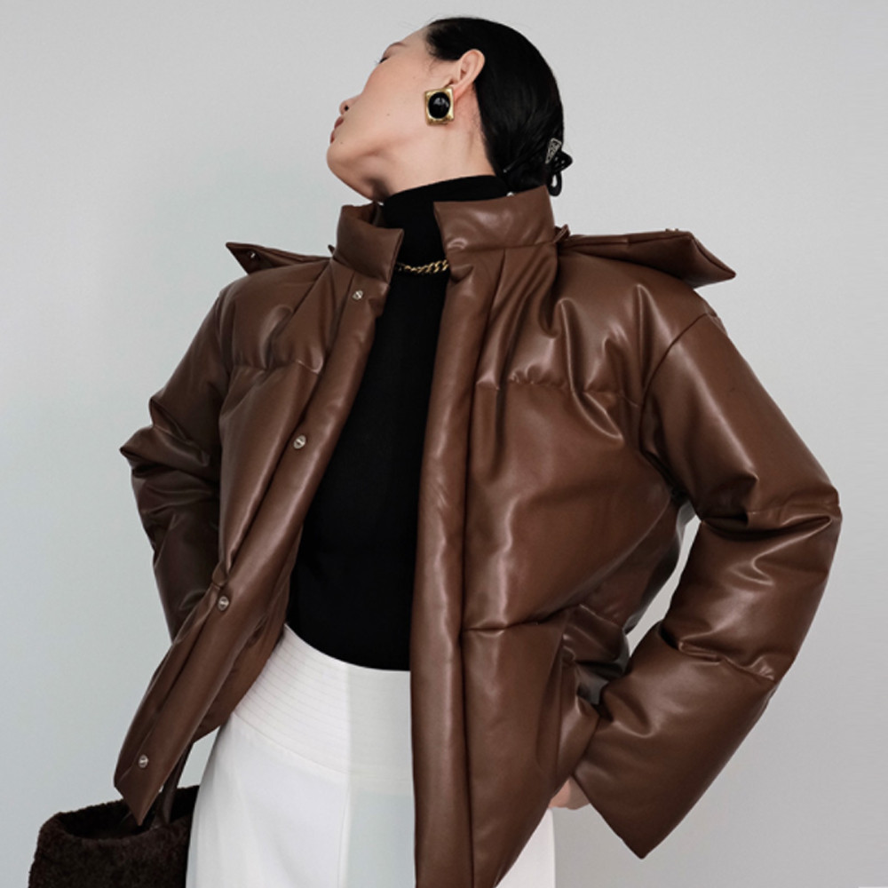 화이트 덕다운 오리털 100% PU 소프트 양피 레더 후드 하이넥 숏 다운 패딩 점퍼